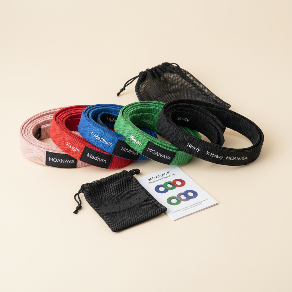 Material: Natural latex + premium cotton blend. Resistance levels: 5 bands (3–16 lbs). Length: 12 inches each. Includes: Carry pouch + exercise guide. Weight: 0.4 lbs total.